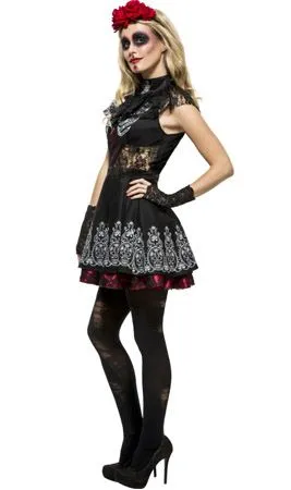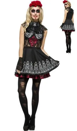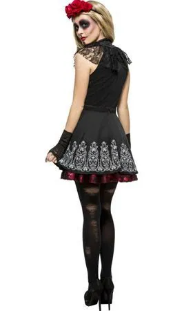 Elegante Schädel! Verwandle Dich in die Muse von Tag der Toten in Mexiko, mit diesem Catrina Spitzen Kostüm für Damen. Schaffe es die erschreckende und sexy Braut auf Terror-Feste, Halloween und Karneval zu sein.