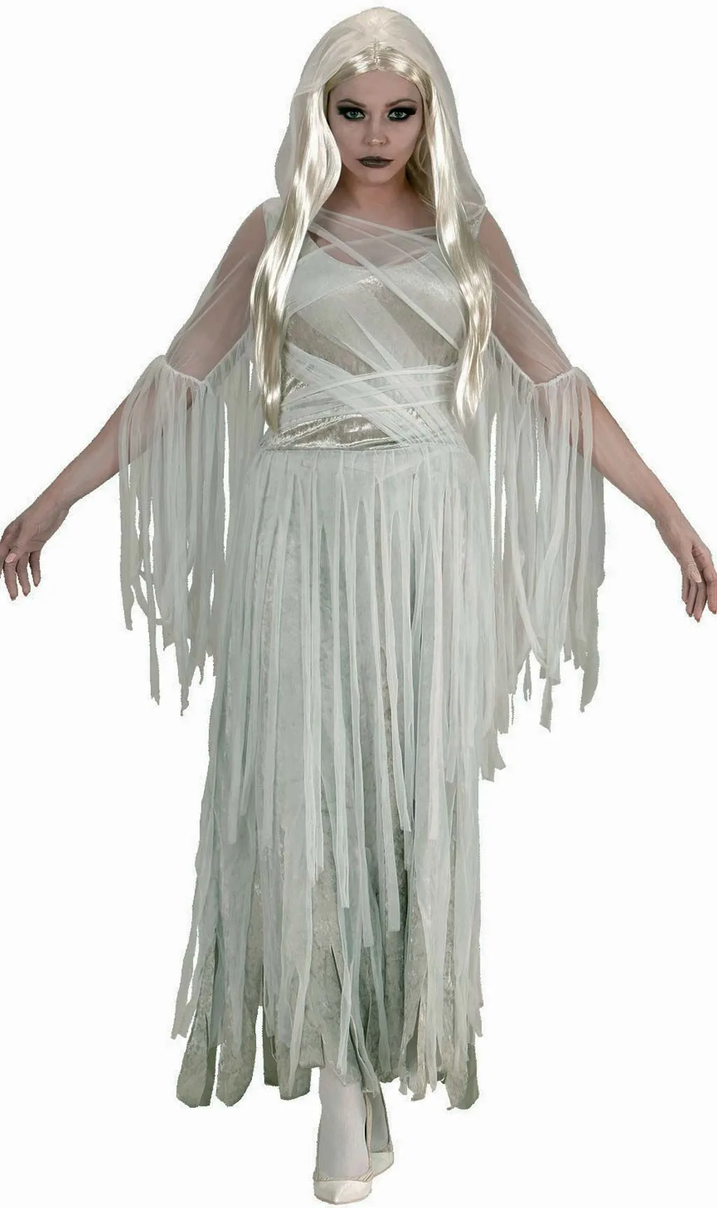 Dieses Geist-Gespenst Kostüm für Damen ist ein sehr schönes und kokettes Kleid, um auf Halloween-Partys zu gehen und Dich in einen hübschen Geist zu verwandeln. Geister und Zombie Kostüme sind für die Nacht der Toten ideal. Du kannst alle Kostüme mit tollen Accessoires wie weiße Perücken und gruselige Make-ups ergänzen. Fühle Dich wie eine Königin auf jede Horror Party.